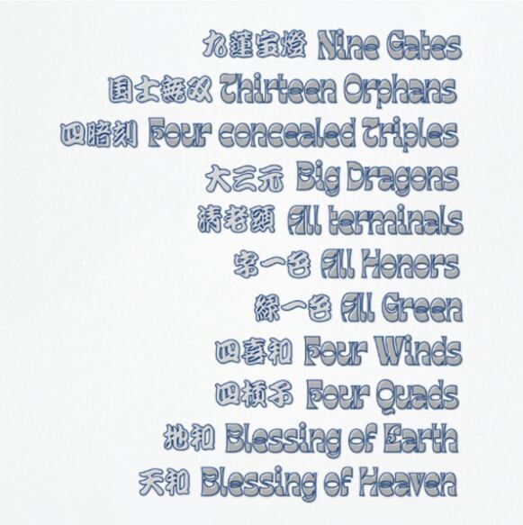 「九蓮宝燈」「国士無双」「四暗刻」「大三元」など役満を