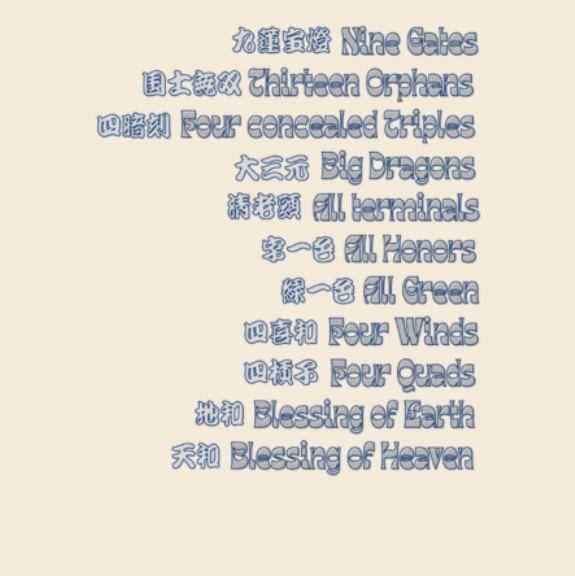 「九蓮宝燈」「国士無双」「四暗刻」「大三元」など役満を