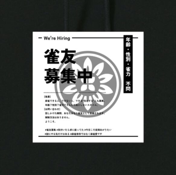 麻雀-mahjong- 『雀友募集中』 スウェットパーカー ブラック