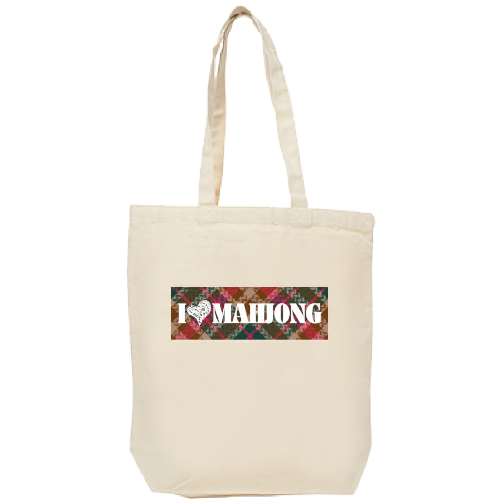 麻雀 -mahjong-『I ♡ Mahjong』タータンチェック柄ボックスロゴ プリントトートバッグ(M) ナチュラル